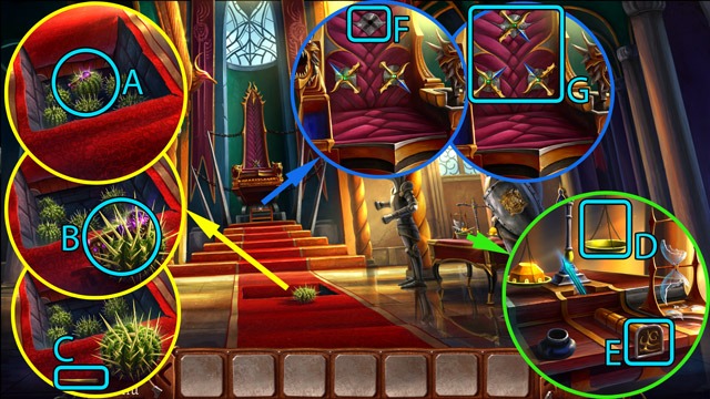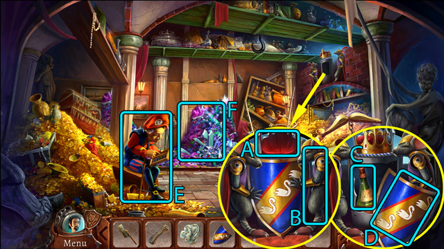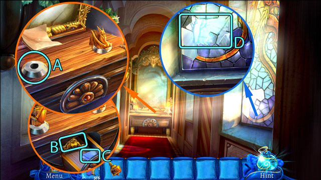 - Pick up the Knight figurine (B) and the fourth Piece of stained glass (C).