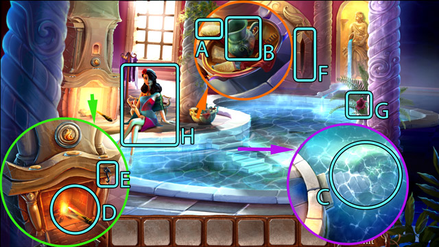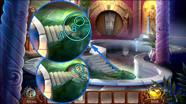 - Use the Piece of mosaic on the broken mosaic (C) and play the minigame. After that, go down the secret passage at the bottom of the pool.