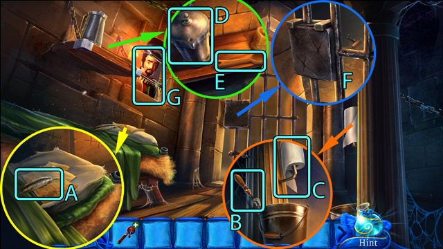 - Extinguish the fire in the fireplace (D) with the Jug with water. Then pick up the cooled down Poker.