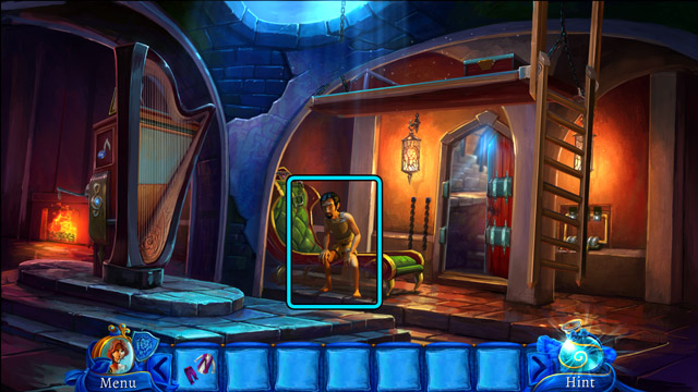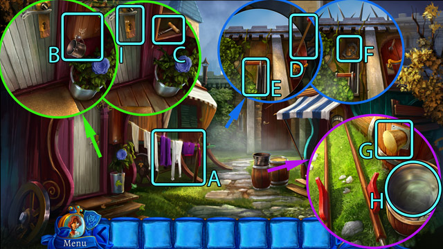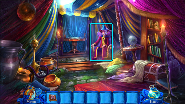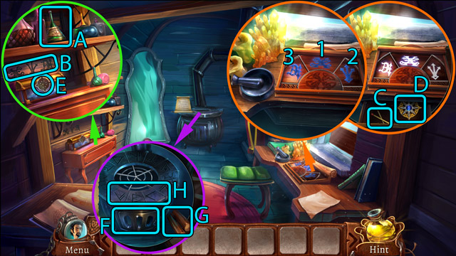 - Place the Scorpion and the Garlic on the magic table (F) and use the Magic wand on them. Then pick up the Pill of happiness.