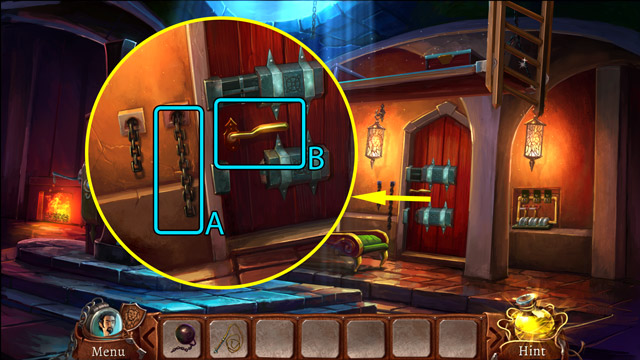 - Open the padlock (C) with the Hair pin.