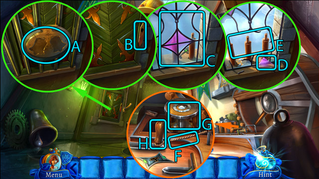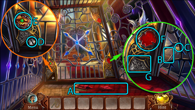 - Use the Pieces of stained glass on the broken glass in the window (D) and play the minigame.