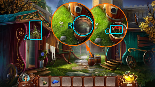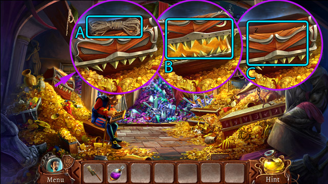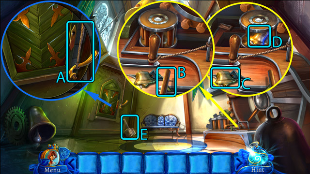 - Look at the pipe with protruding branches. Pick up the Piece of rope (B) and pull the small lever (C).