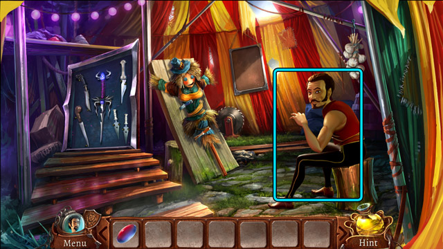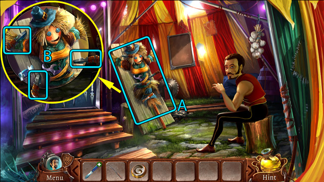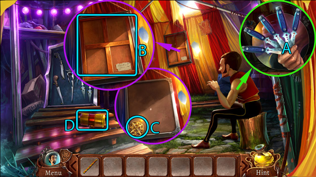 - After dialogue with the Knife Thrower pick one Blunt knife from his set of knives (A).